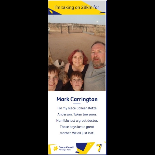 Please sponsor me and help those affected by cancer. Every step counts because all funds raised will help Cancer Council NSW work towards the vision of a cancer free future. Thank you for your support!